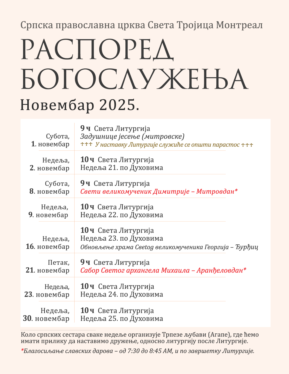 (Благосиљање славских дарова вршиће се пре Свете Литургије од 7:30 до 8:45, и по завршетку Свете Литургије)