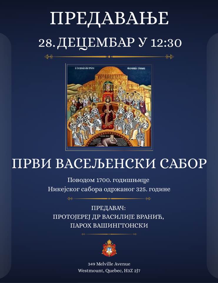 Са задовољством вас позивамо на предавање поводом обележавања 1700. годишњице Првог Васељенског сабора, одржаног у Никеји 325. године.
