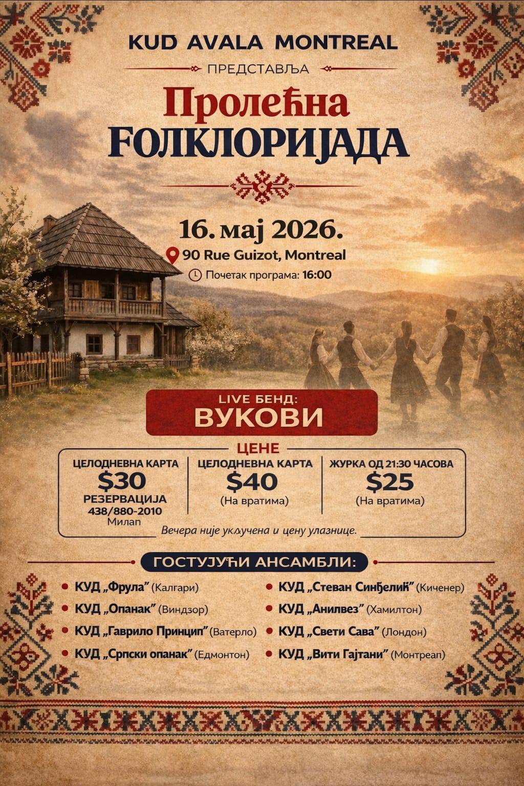 Сваке године, у пролеће, окупимо се на једној сцени и подсетимо се зашто вреди чувати оно што имамо, што су нам преци оставили у наслеђе. Овог пролећа угостићемо ансамбле из многих крајева Канаде — очекује вас богат програм испуњен песмом и народнихм играма. Дођите и видите шта свако од њих има да покаже.